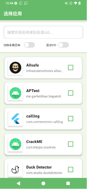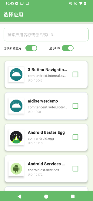 然后进入选择 app 列表,这里区分了系统应用和用户应用,可以通过按钮反选,还可以显示应用的 uid。选中的 app 始终置顶